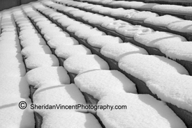 Following a "lake-effect" snow a bit of sun and differential melting caused an interesting repetitious pattern on the river-walk stairs outside the Clarion Riverside Hotel.
