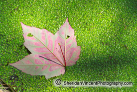 maple leave up large enough with a 400mm lens to show its color contrast to the surrounding green floating plants.