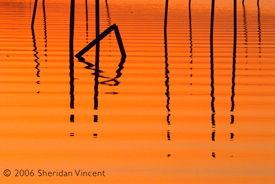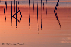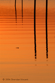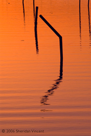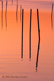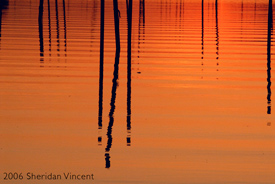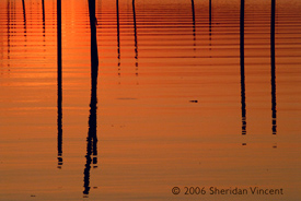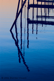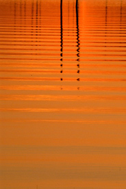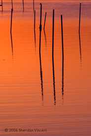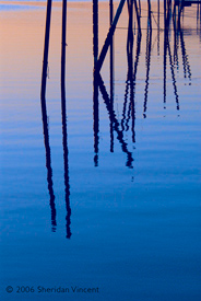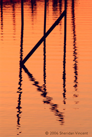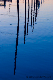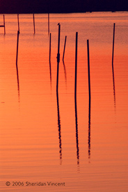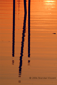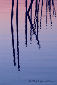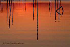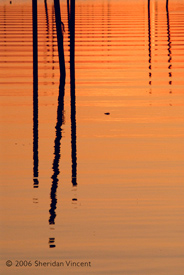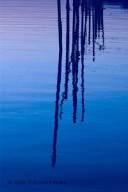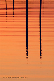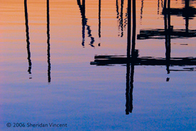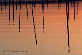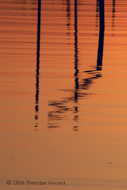 the reflections of numerous mooring poles and docks in the bay presented a range